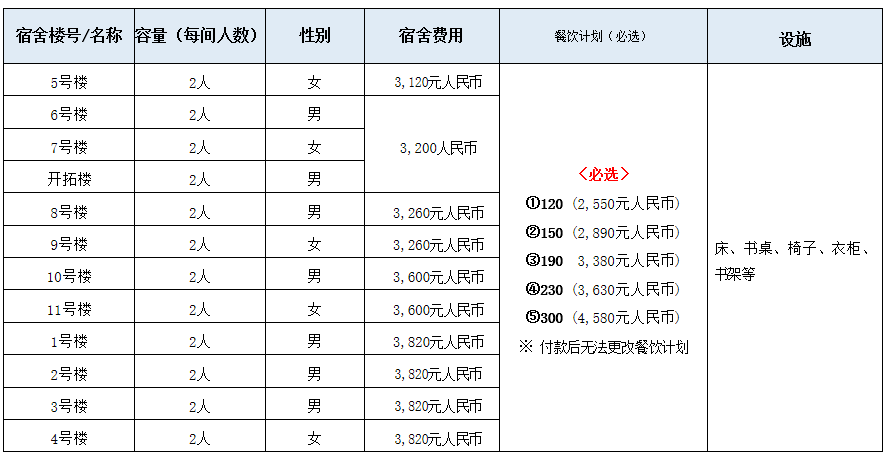 总费用:114万韩元~169万韩元,约5700元人民币~8500人民币,包含:住宿费(4个月)及餐费(参照1~5选项费用不同)
